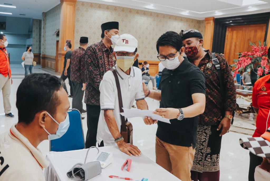 Sekretaris Daerah Kabupaten Badung sekaligus Ketua Forum Kerukunan Umat Beragama (FKUB) I Wayan Adi Arnawa meninjau pelaksanaan Vaksinasi Booster yang diselenggarakan oleh Polres Badung, di Gedung Balai Budaya Giri Nata Mandala Puspem Badung, Sabtu (5/3). Target vaksin dosis 3 untuk 700 peserta ini untuk pemuka agama, anggota FKUB Badung dan masyarakat umum. Turut hadir Kapolres Badung AKBP Leo Dedy Defretes, Wakil Ketua FKUB Badung Jonathan Suharto, Perwakilan PHDI Badung, beserta Perwakilan MUI.