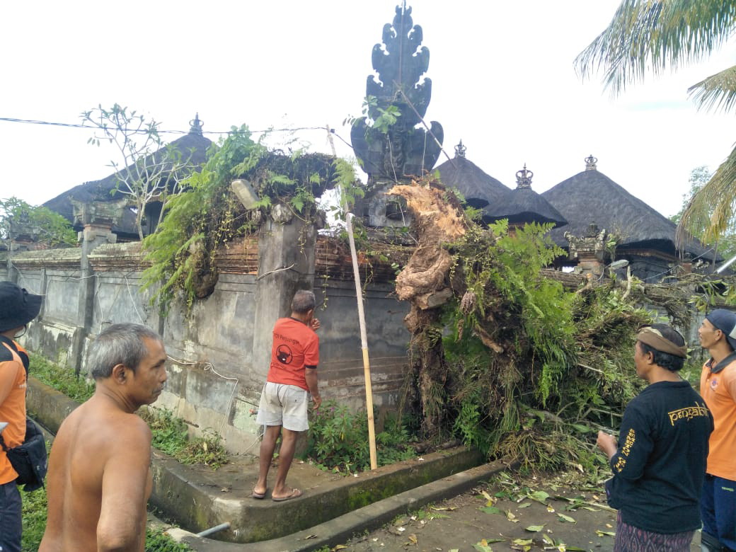 Pohon kamboja yang tumbang tersebut tidak sampai menimpa pelinggih yang berada di sebelahnya, “Disebelahnya ada palinggih pura, tapi itu tidak kena, ‘ ucapnya.