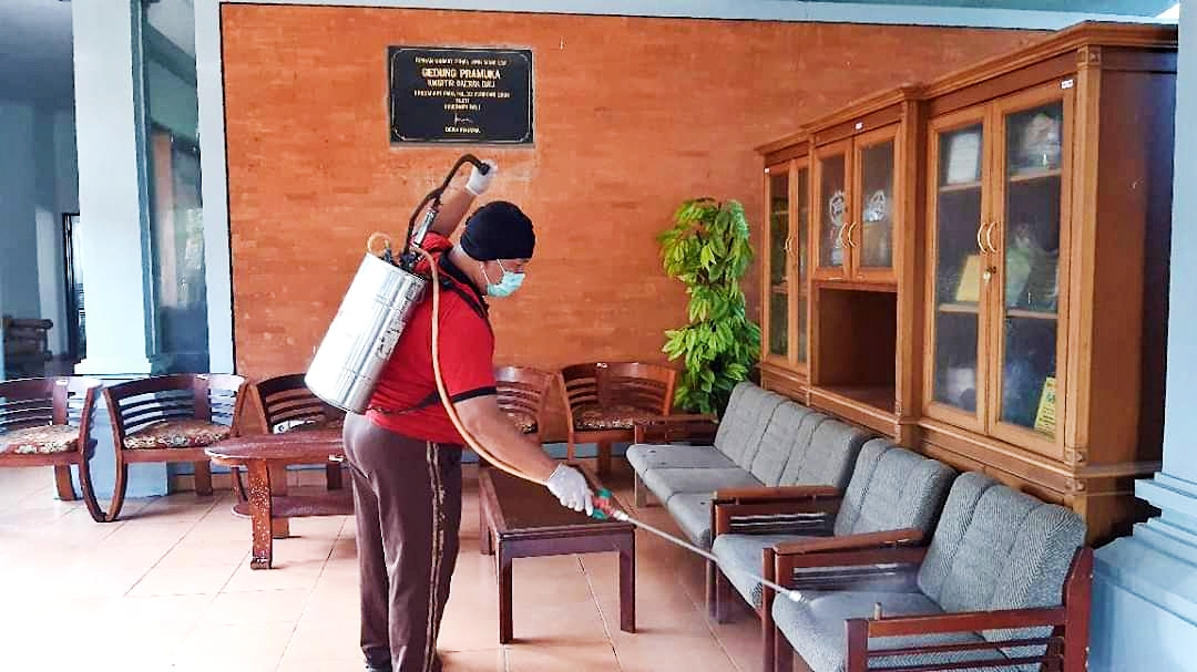 Menyikapi penyebaran Virus Corona atau Covid-19 Gerakan Pramuka Kwartir Daerah Bali bekerjasama dengan Kwarcab Denpasar melaksanakan Penyemprotan Disinfektan di lingkungan Gedung Kwarda Bali pada Minggu, 29 Maret 2020.