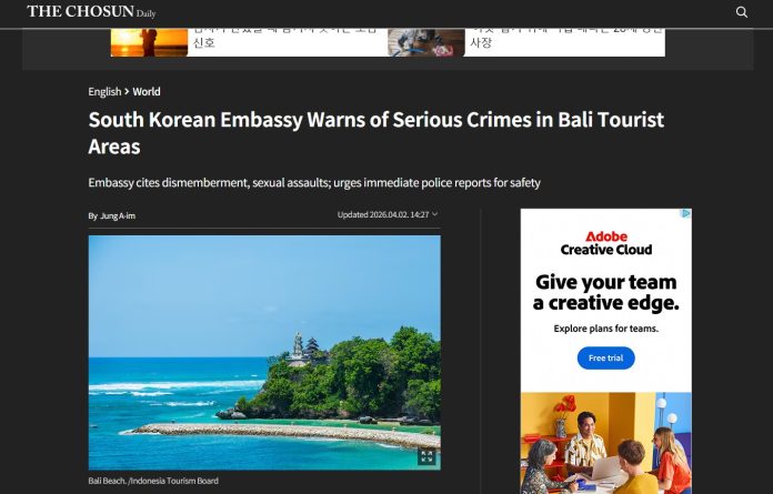 Kedutaan Besar Kedutaan Besar Korea Selatan di Indonesia mengeluarkan rilis resmi pada 1 April 2026 yang berisi peringatan kepada wisatawan asal Korea Selatan yang akan berkunjung ke Bali agar meningkatkan kewaspadaan.
