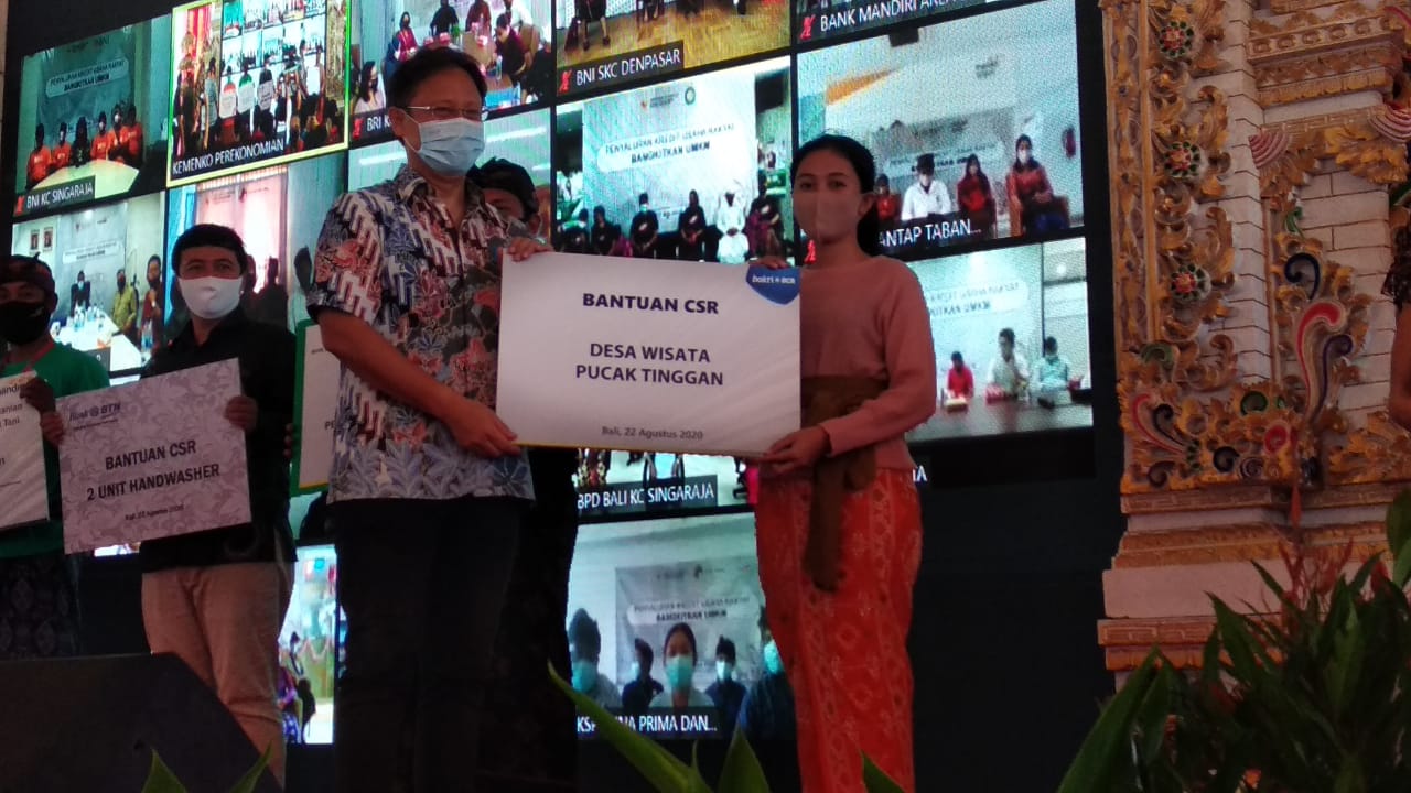 BCA Dukung Penyaluran KUR di Desa Wisata Kertalangu Denpasar – Wakil Menteri BUMN Budi Gunadi Sadikin (kiri) bersama secara simbolis menyerahkan Bantuan CSR kepada perwakilan Desa Wisata Pucak Tinggan (kanan) di tengah-tengah acara Penyaluran KUR di Provinsi Bali, Sabtu (22/08). PT Bank Central Asia Tbk (BCA) sebagai bagian dari sistem keuangan Nasional berkomitmen untuk turut berkontribusi dalam keberlangsungan UMKM di Indonesia. Hal ini salah satunya diwujudkan melalui dukungan terhadap acara KUR di Desa Wisata Kertalangu Denpasar.