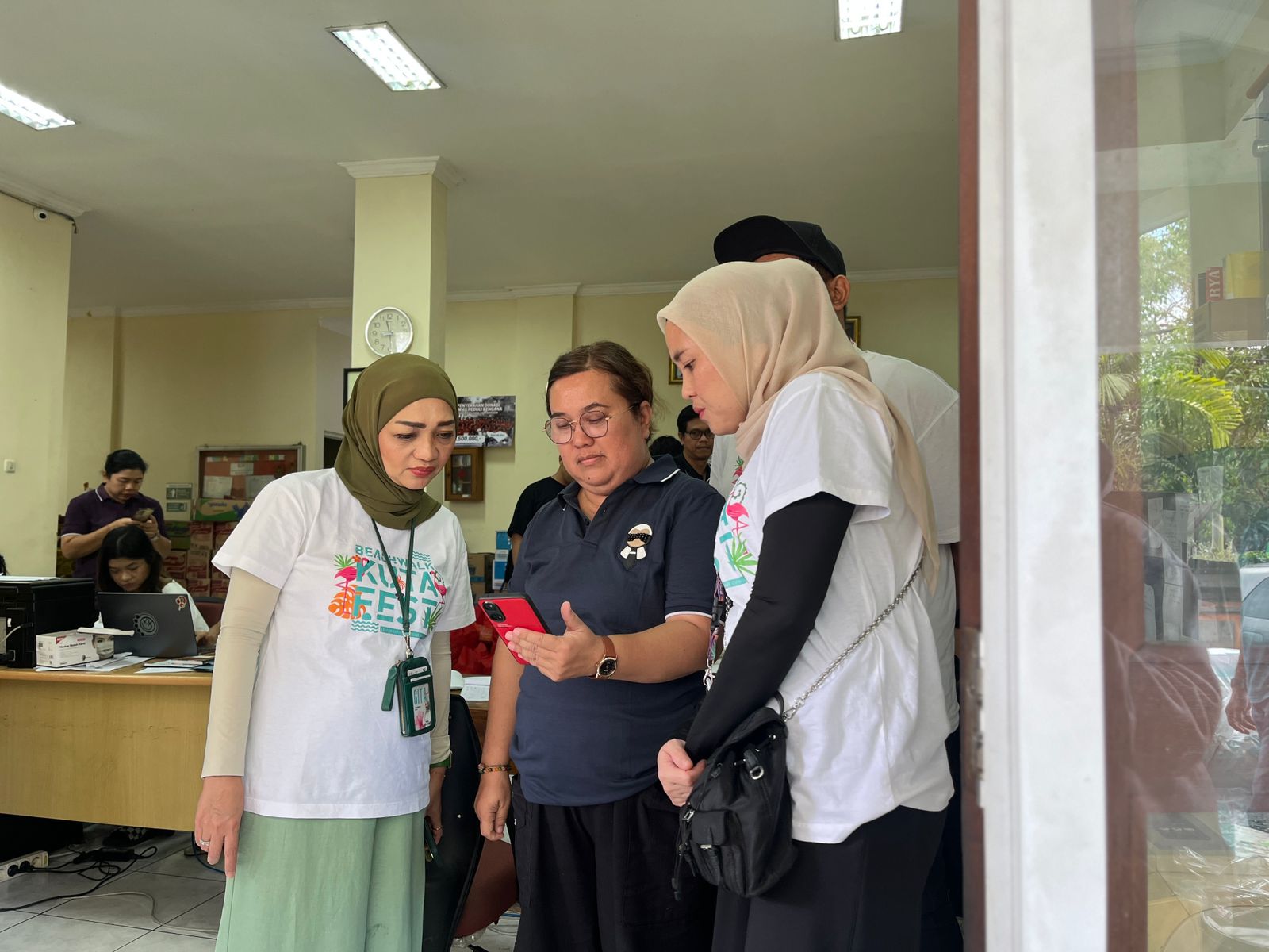General Manager Beachwalk Shopping Center, Gita Sunarwulan melihat update terbaru kondisi korban dari handphone Kepala Dinas Sosial Kota Denpasar, I Gusti Ayu Laxmy Saraswaty.