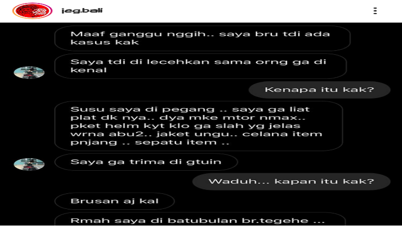 Didalam salah akun sosialmedia di Instagram dilihatkannya sebuah screenshoot dari DM seorang wanita yang mengaku telah dilecehkan oleh seseorang yang tidak dikenal diduga laki-laki mengendarai sepeda motor jenis Nmax di jalan raya Batubulan, Banjar Tegehe sekitar rumah wanita tersebut.
