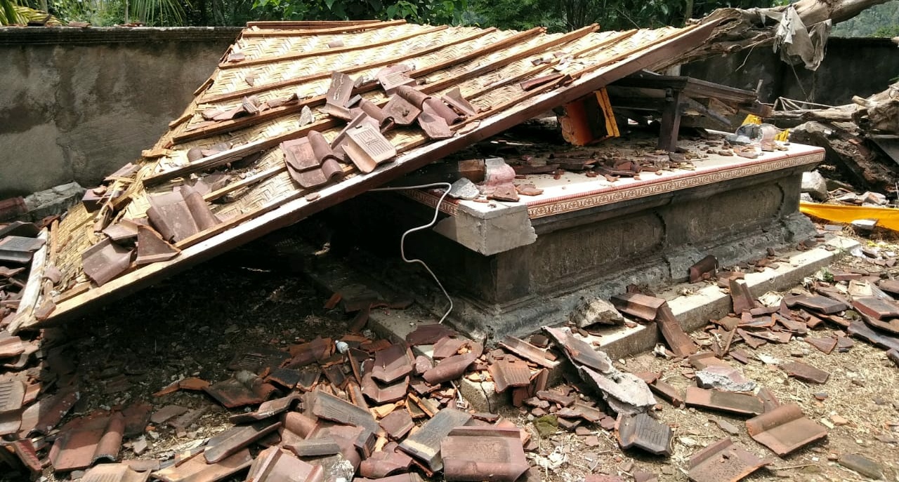 Pura Taman Banjar Adat Sumber Mis di Desa Pekutatan, Kecamatan Pekutatan rusak berat tertimpa pohon beringin, Sabtu (29/2) siang.