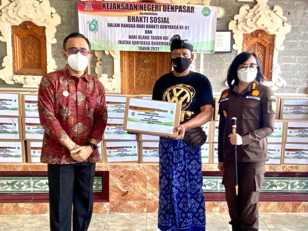 Dalam rangka Hari Bhakti Adhyaksa Ke-61 dan Hari Ulang Tahun XXI Ikatan Adhyaksa Dharmakarini Tahun 2021, Kejaksaan Negeri Denpasar bersinergi dengan Pemerintah Kota Denpasar menggelar Bhakti Sosial dengan memberikan bantuan berupa sembako kepada masyarakat kurang mampu dan yang terdampak Covid-19 di Kota Denpasar.