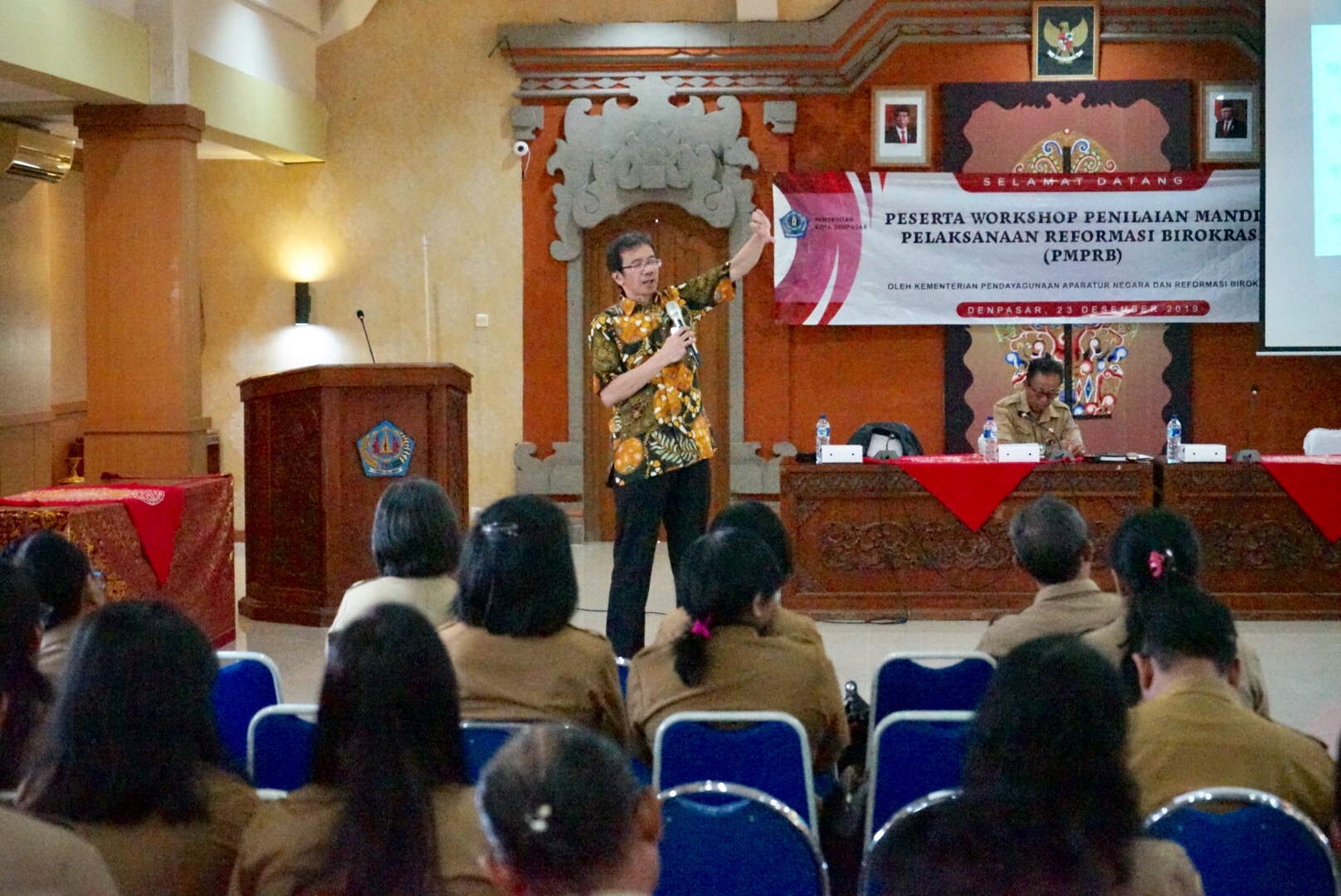Pemerintah Kota Denpasar melalui Inspektorat Kota Denpasar, bersinergi dengan Kementrian Pemberdayagunaan Aparatur Negara dan Reformasi Birokrasi (Menpan RB) menggelar Workshop Penilaian Mandiri Pelaksanaan Reformasi Birokrasi (PMPRB) tahun 2019. Kegiatan yang diikuti oleh seluruh pimpinan OPD dan Kasubag Perencanaan di lingkungan Pemkot Denpasar ini digelar Senin (23/12) di Gedung Santi Graha Denpasar.
