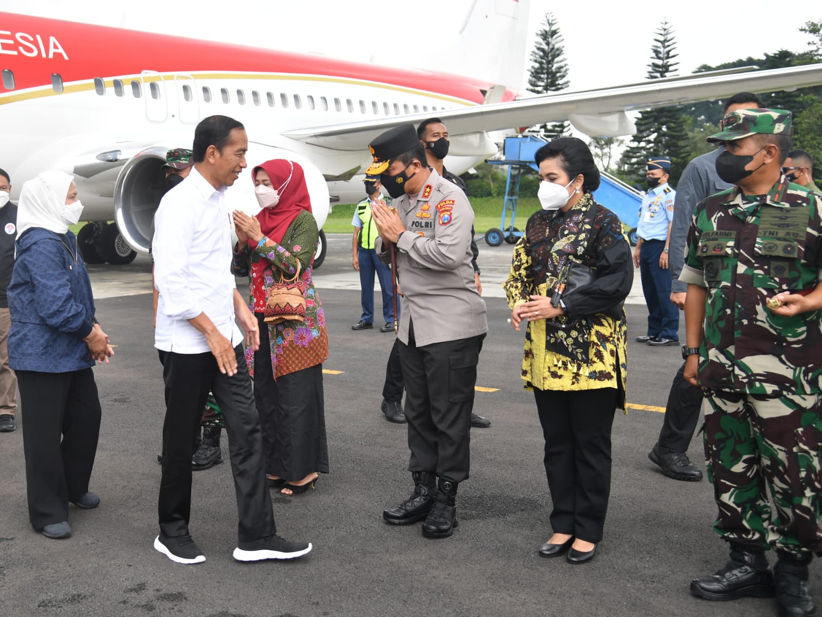 Turut mendampingi Presiden dan Ibu Iriana dalam penerbangan menuju Provinsi Jawa Timur yaitu Menteri Koordinator Bidang Politik, Hukum, dan Keamanan Mahfud Md., Menteri Koordinator Bidang Pembangunan Manusia dan Kebudayaan Muhadjir Effendy, Kapolri Jenderal Listyo Sigit Prabowo, Kepala Sekretariat Presiden Heru Budi Hartono, Sekretaris Militer Presiden Laksda TNI Hersan, Komandan Paspampres Marsda TNI Wahyu Hidayat Sujatmiko, dan Deputi Bidang Protokol, Pers, dan Media Sekretariat Presiden Bey Machmudin.