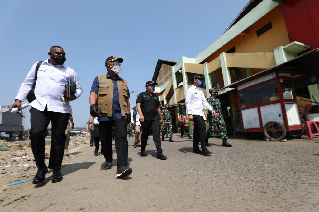 Kepala Badan Nasional Penanggulangan Bencana (BNPB) Letjen TNI Ganip Warsito SE., MM., melakukan kegiatan ‘blusukan’ ke Pasar Bitingan, Kota Kudus, Jawa Tengah, Kamis (3/6). Kegiatan tersebut dilakukan Ganip guna melihat langsung bagaimana penerapan protokol kesehatan yang dilakukan di salah satu pusat jual beli di Kota Kretek tersebut.