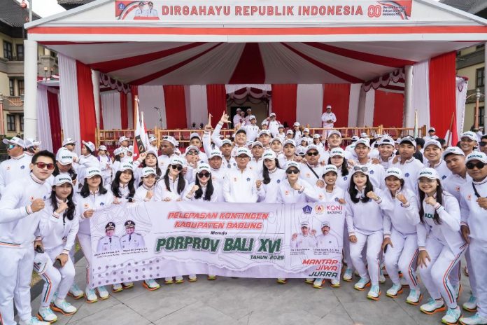 Bupati Badung l Wayan Adi Arnawa mengukuhkan serta melepas kontingen Kabupaten Badung dalam rangka PORPROV Bali XVI Tahun 2025 bertempat di Lapangan Puspem Badung, Jumat (15/8).