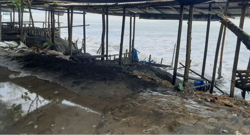 Hasil kaji cepat lapangan BPBD mencatat sebanyak 40 kios tertimbun pasir dengan ketinggian timbunan 15 cm, jalan paving desa tergerus gelombang air pantai dan beberapa kios bambu rusak.