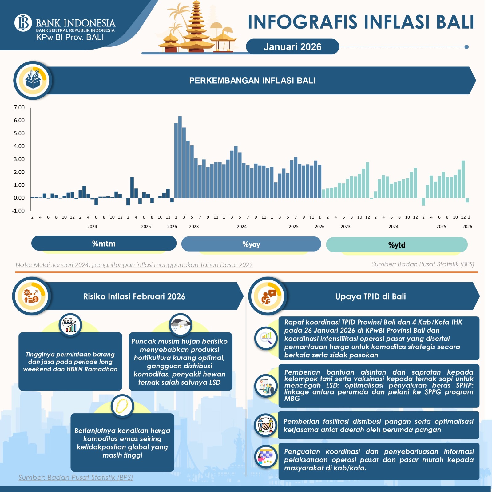 Badan Pusat Statistik (BPS) Provinsi Bali mencatat perkembangan inflasi Bali pada Januari 2026 mengalami deflasi sebesar -0,34 persen secara bulanan (month to month/mtm). Kondisi ini sejalan dengan pola musiman (seasonal) setelah pada Desember 2025 Bali mencatat inflasi sebesar 0,70 persen (mtm).