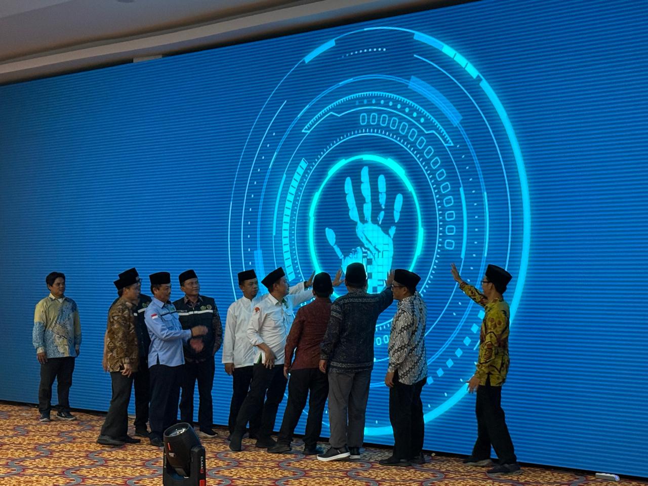 Prosesi pembukaan Bimtek ditandai dengan peletakan telapak tangan pada mesin digital di tembok aula yang dilakukan oleh Dirjen PHU Kemenag RI yang didamping Sekretaris Umum (Sekum)