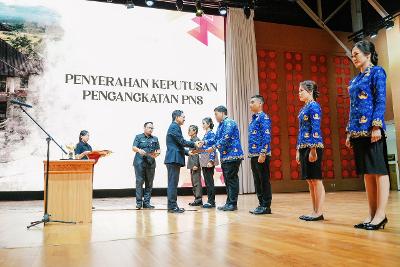 Bupati Adi Arnawa mengambil sumpah dan melantik Pejabat Pimpinan Tinggi Pratama dan menyerahkan SK PNS bagi CPNS hasil seleksi pengadaan PNS formasi tahun 2024 di Balai Budaya Giri Nata Mandala, Puspem Badung, Selasa (31/3).