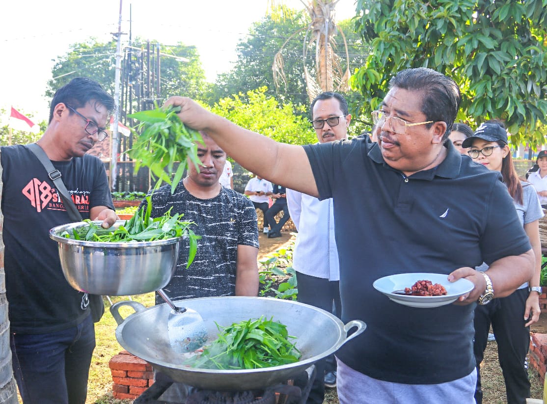 Tidak hanya mencontohkan memanen di kebun kota, PAS menunjukkan kelihaiannya dalam mengolah sayur kangkung segar hasil panen Singaraja Smart Agrocity, menjadi menu sederhana namun enak, murah, dan sehat yaitu kangkung belacan.