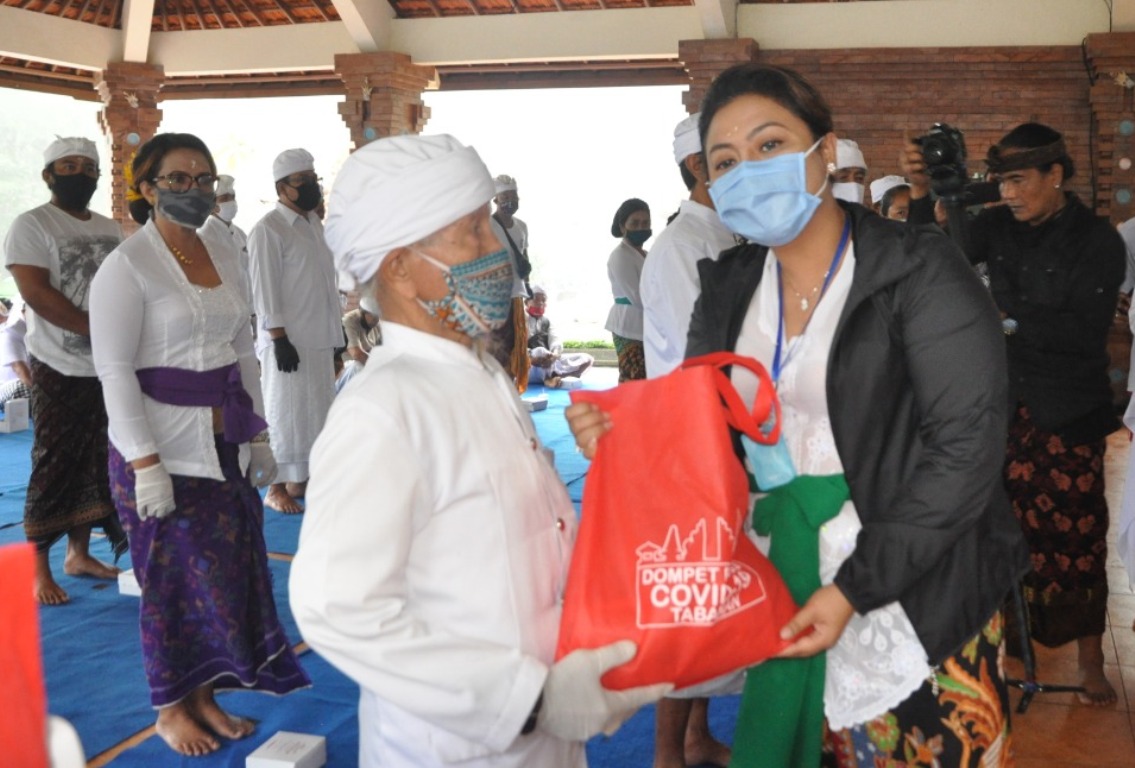 Pada kesmpatan itu, Bupati Eka juga menyerahkan bantuan Dompet Peduli Covid-19 Tabanan, berupa 170 Paket Sembako kepada 170 Pemangku dan 200 pcs masker kain dari Yayasan Ekalawya. Turut juga BPD Bali meberikan bantuan 4 buah wastavel untuk Pura Luhur Batukau.