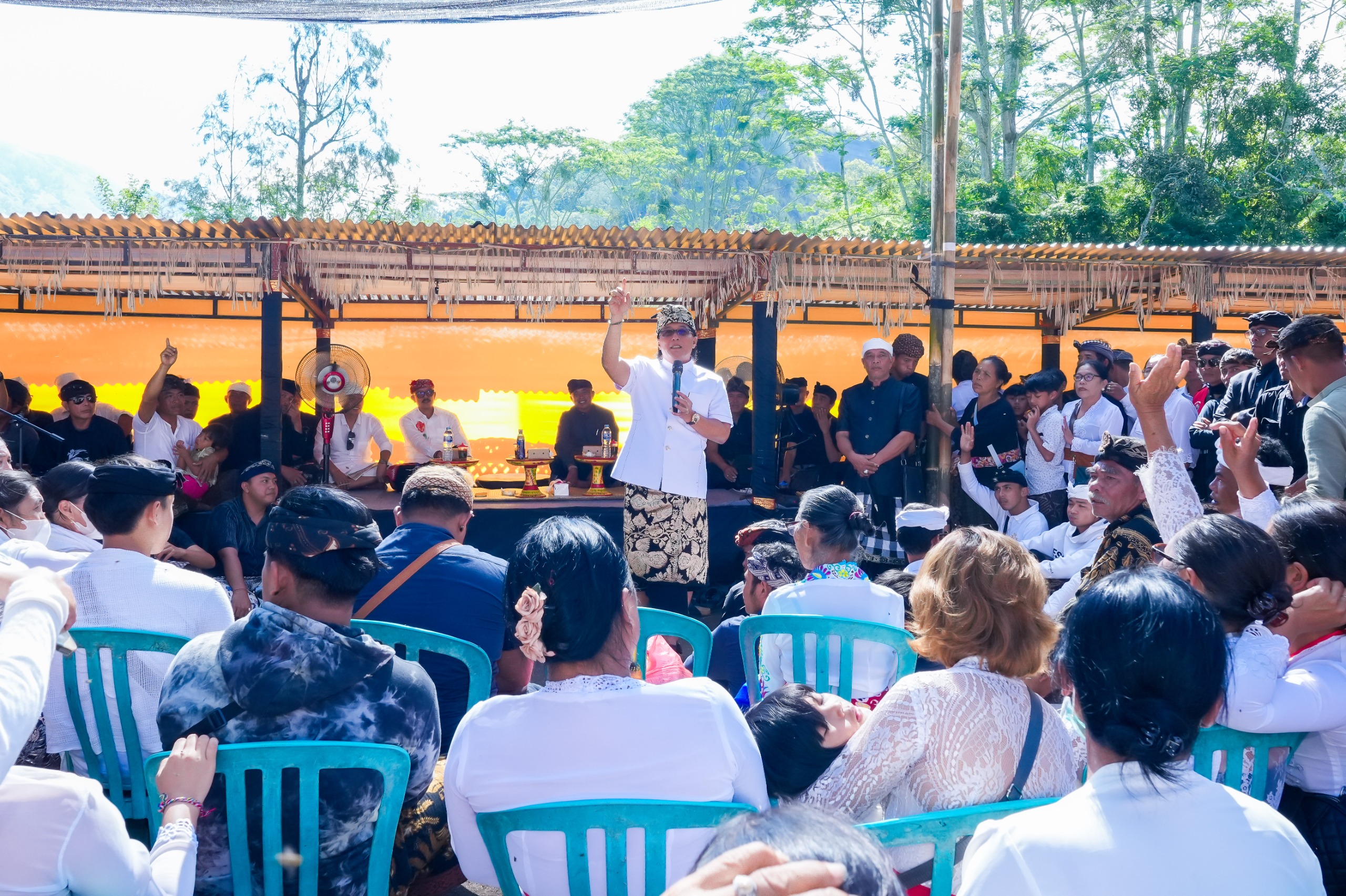 “Saya hadir di sini untuk meringankan beban krama sekalian dan saya akan rampungkan pembangunan wantilan Desa Adat Songan untuk krama di sini. Tradisi ini harus kita jaga dan termasuk juga adat, agama, seni, dan budaya, ini kita lakukan bersama-sama dan bersatu untuk melestarikannya, Songan boleh maju, tetapi dengan kemajuan Songan jangan sampai menggerus akar adat, agama, budaya, dan seni kita di Bali,” imbuhnya.