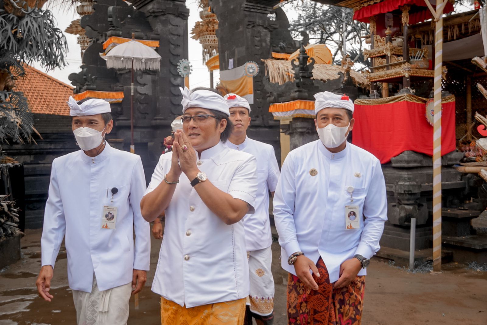 Bupati Nyoman Giri Prasta saat menghadiri karya mamungkah dan ngenteg linggih di Pura Penataran Bale Agung Desa Adat Katung Kintamani Bangli, Jumat (15/4).