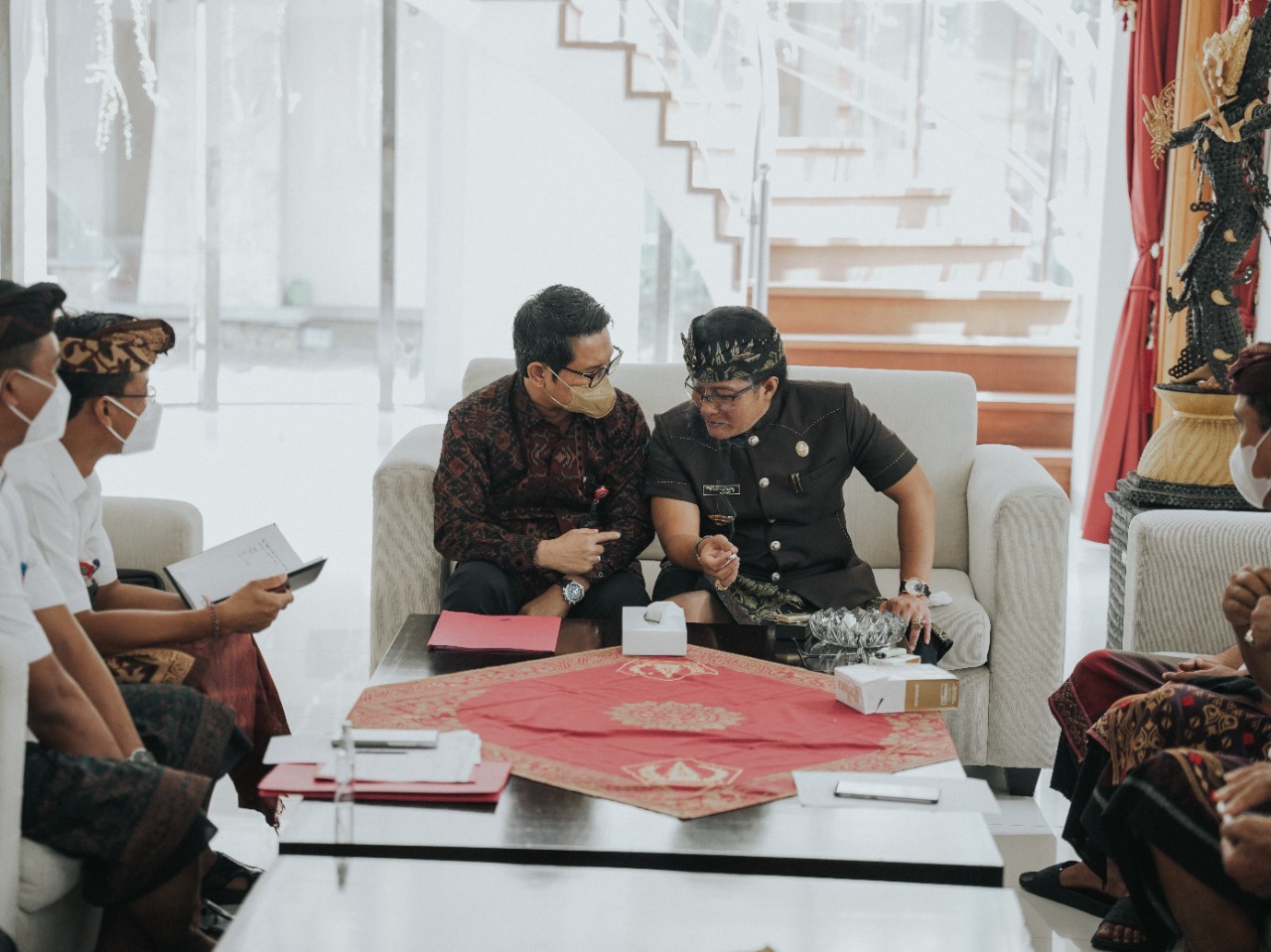 Bupati Badung Nyoman Giri Prasta didampingi Sekda Wayan Adi Arnawa menerima audiensi pengempon Pura Luhur Uluwatu I Gusti Ngurah Jaka Pratidnya bersama Bendesa Adat Pecatu Made Sumerta dan jajaran pengurus desa adat, terkait rencana Karya Panca Wali Krama di pura tersebut yang puncaknya akan jatuh pada tanggal (26/11) mendatang. Bertempat di Rumah Jabatan Bupati Badung, Senin (8/11). Turut hadir Asisten Pemerintahan dan Kesra Kabupaten Badung Nyoman Sujendra, Kadis Kebudayaan Gde Eka Sudarwitha, Camat Kuta Selatan dan panitia Karya Panca Wali Krama Pura Luhur Uluwatu.