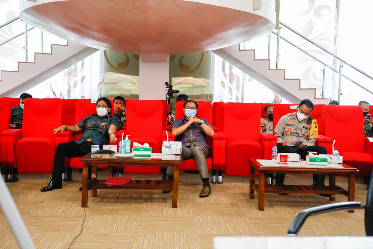 Bupati Giri Prasta bersama Wabup Suiasa, Ketua DPRD Putu Parwata, beserta Forkopimda, KPU dan Bawaslu Badung saat mengikuti Rakorsus melalui Vidcon dari Puspem Badung, Jumat (18/9).