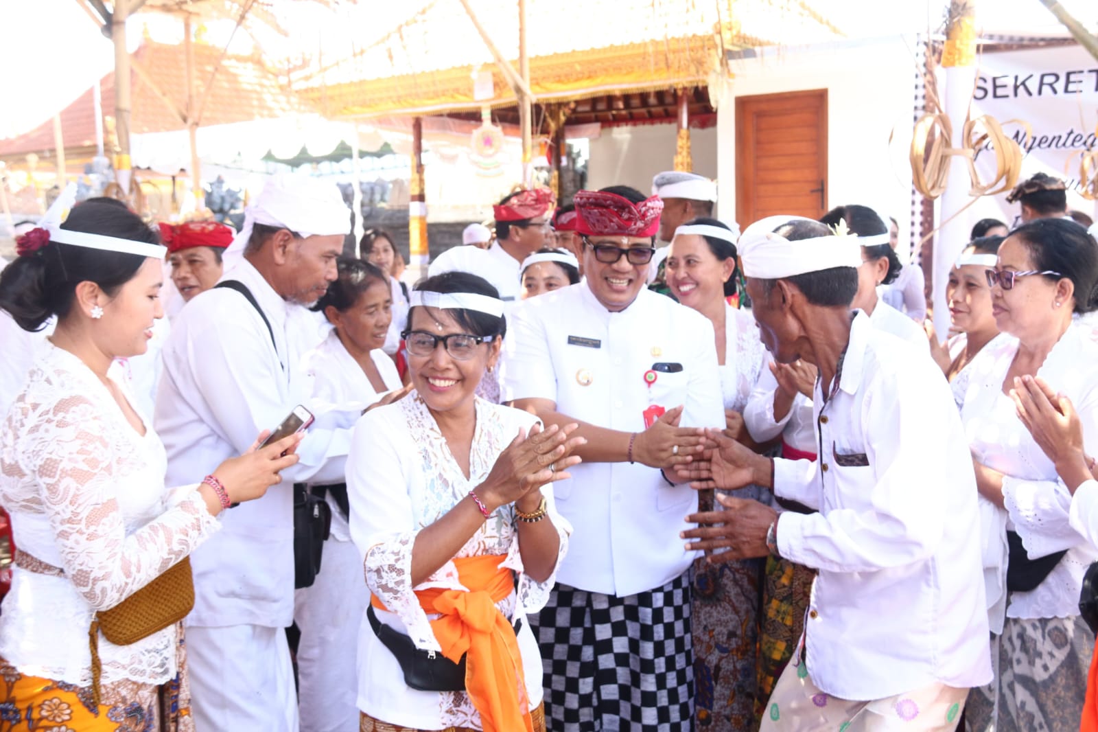 Sambutan hangat krama setempat dan pertunjukan tari-tarian mengawali kehadiran Bupati Sanjaya, sebelum mengikuti persembahyangan dan menyaksikan langsung rangkaian upacara sakral Melaspas dan Mendem Pedagingan yang dipuput oleh Ida Pedanda Mas Timbul dari Griya Tengah Kaba-Kaba.