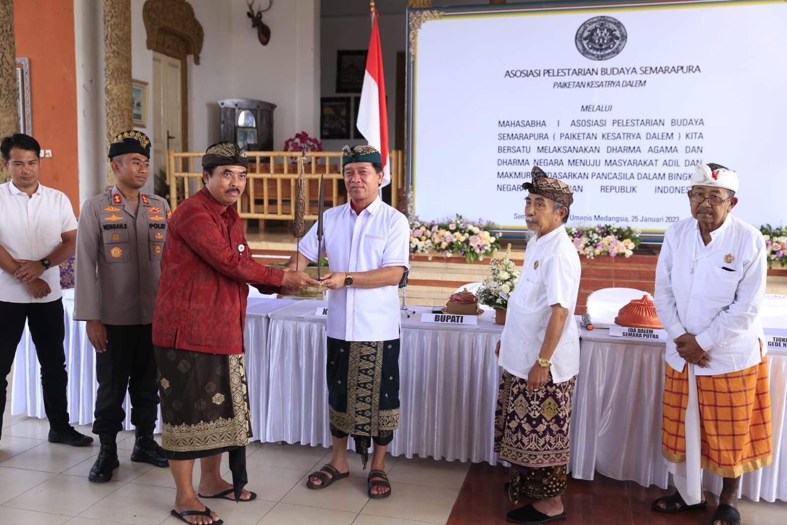 Bupati Klungkung, I Nyoman Suwirta menghadiri Mahasabha I Asosiasi Pelestari Budaya Semarapura “Paiketan Kesatrya Dalem” di Pendopo Puri Agung Klungkung, Rabu (25/1). Turut Hadir dalam Mahasabha tersebut, Pengelingsir Puri Agung Klungkung, Ida Dalem Semara Putra, Kapolres Klungkung, AKBP I Nengah Sudiarta bersama Forkompinda Klungkung, Kadis Kebudayaan Klungkung, serta seluruh Paiketan Kesatrya Dalem.