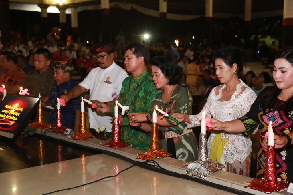 Bupati Klungkung I Nyoman Suwirta didampingi Ny. Ayu Suwirta dan Wakil Bupati Klungkung I Made Kasta didampingi Ny. Sri Kasta menghadiri Perayaan Natal Bersama Kabupaten Klungkung di Balai Budaya Ida Dewa Agung Istri Kanya, Semarapura, Selasa (7/1/2020).
