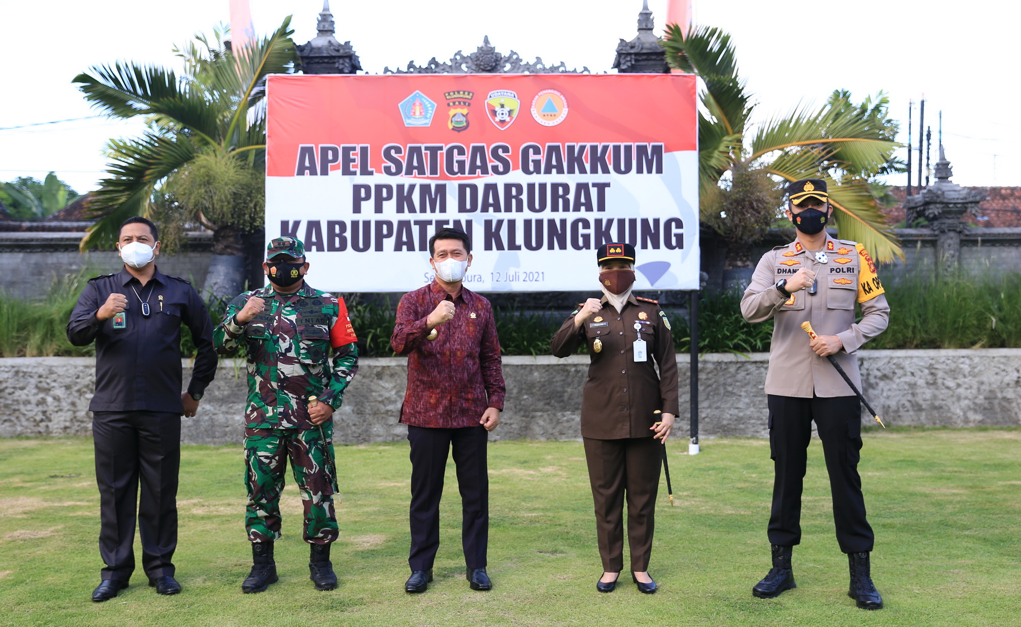 Bupati Klungkung, I Nyoman Suwirta menjadi pemimpin Apel Kesiapan Operasi Yustisi PPKM Darurat di Lapangan Polres Klungkung, Senin (12/7). “Seperti telah kita ketahui bersama bahwa kita masih dihadapkan pada masalah pendemi Covid-19 yang belum memperlihatkan tanda-tanda akan berakhir. Berbagai upaya juga telah dilakukan, baik Pemerintah Pusat dan Pemerintah Daerah telah bersinergi dengan multi pihak namun sampai sekarang masih juga pendemi tersebut belum berakhir. Semoga PPKM ini menjadi yang terakhir dan badai segera berlalu,” ujar Bupati Suwirta didampingi Sekda Klungkung I Gede Putu Winasta, Kapolres Klungkung AKBP I Made Dhanuardana, S.I.K.,M.H.