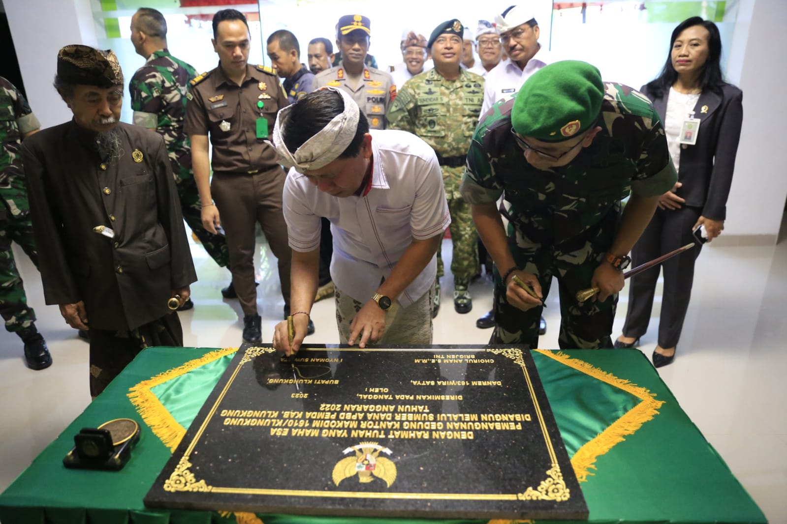 Bupati Klungkung, I Nyoman Suwirta meresmikan sekaligus penandatanganan Naskah Perjanjian Hibah Daerah (NPHD) dan Berita Acara Serah Terima (BAST) Kantor Makodim 1610/Klungkung Baru di Aula Makodim 1610/Klungkung, Senin (6/3). Turut hadir Komandan Korem 163/Wirasatya Kolonel Inf Choirul Anam, Forkompinda Klungkung, dan undangan terkait lainnya.