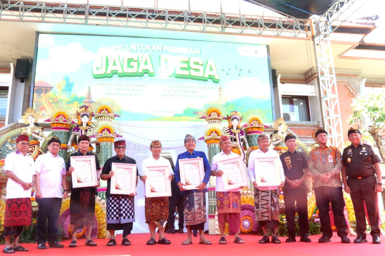 Selanjutnya dilakukan penandatanganan naskah perjanjian kerja sama antara para Bupati/Walikota se-Bali dengan Kejaksaan Negeri se-Provinsi Bali. Penandatanganan ini menjadi simbol sinergi pemerintah daerah dan kejaksaan dalam mengawal pembangunan desa. Sementara itu, Gubernur Bali, Wayan Koster, dalam sambutannya mengapresiasi Kejaksaan Tinggi Bali dan seluruh kepala daerah yang mendukung program Jaga Desa. Program ini sangat progresif, inovatif, dan inspiratif dalam memecahkan masalah di tingkat desa dan desa adat.