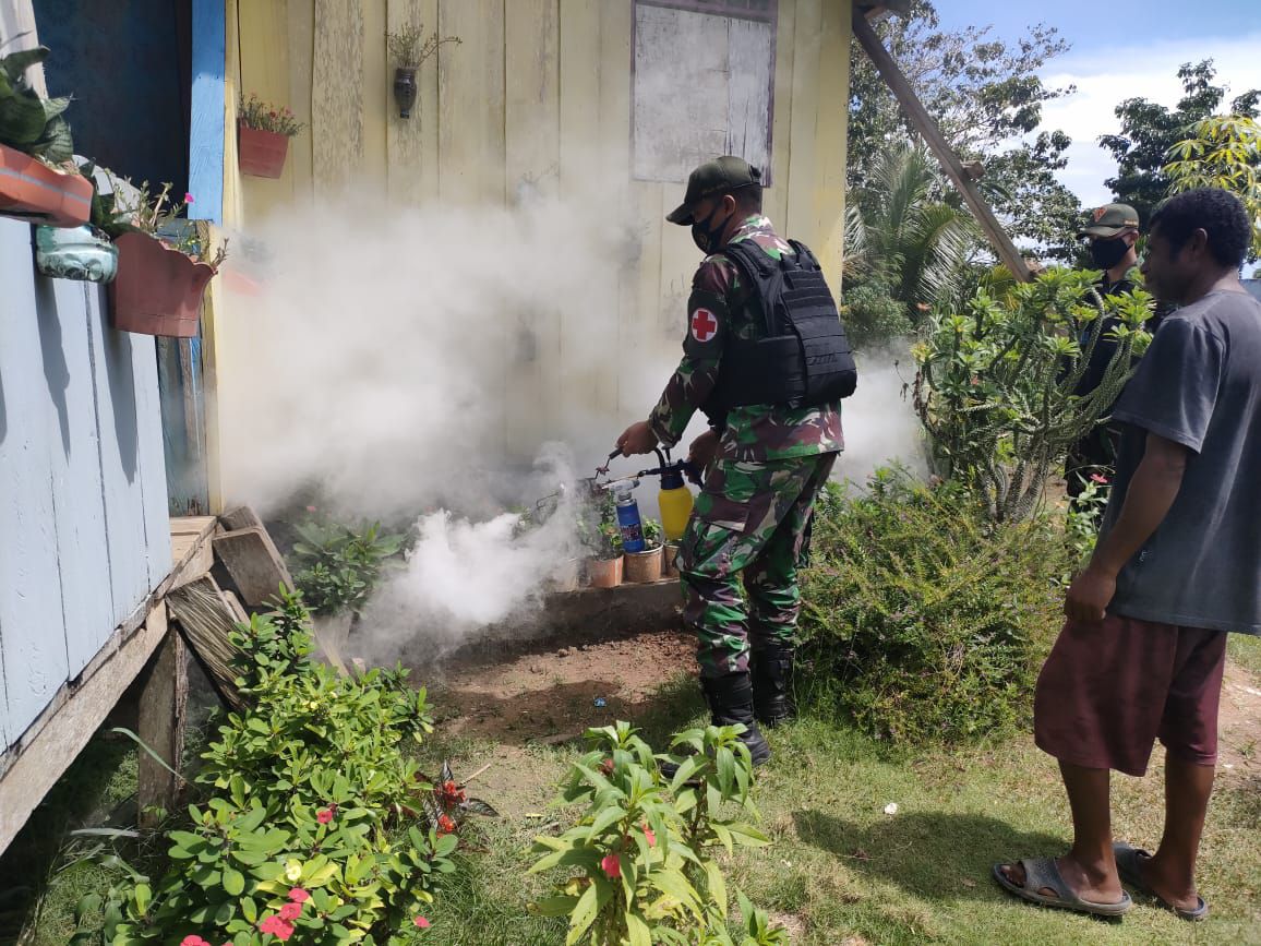 Kegiatan fogging yang dilakukan oleh personel Satgas Yonif 131/Braja Sakti Pos Skamto dengan melakukan penyisiran ke rumah-rumah warga Kampung Yomong.