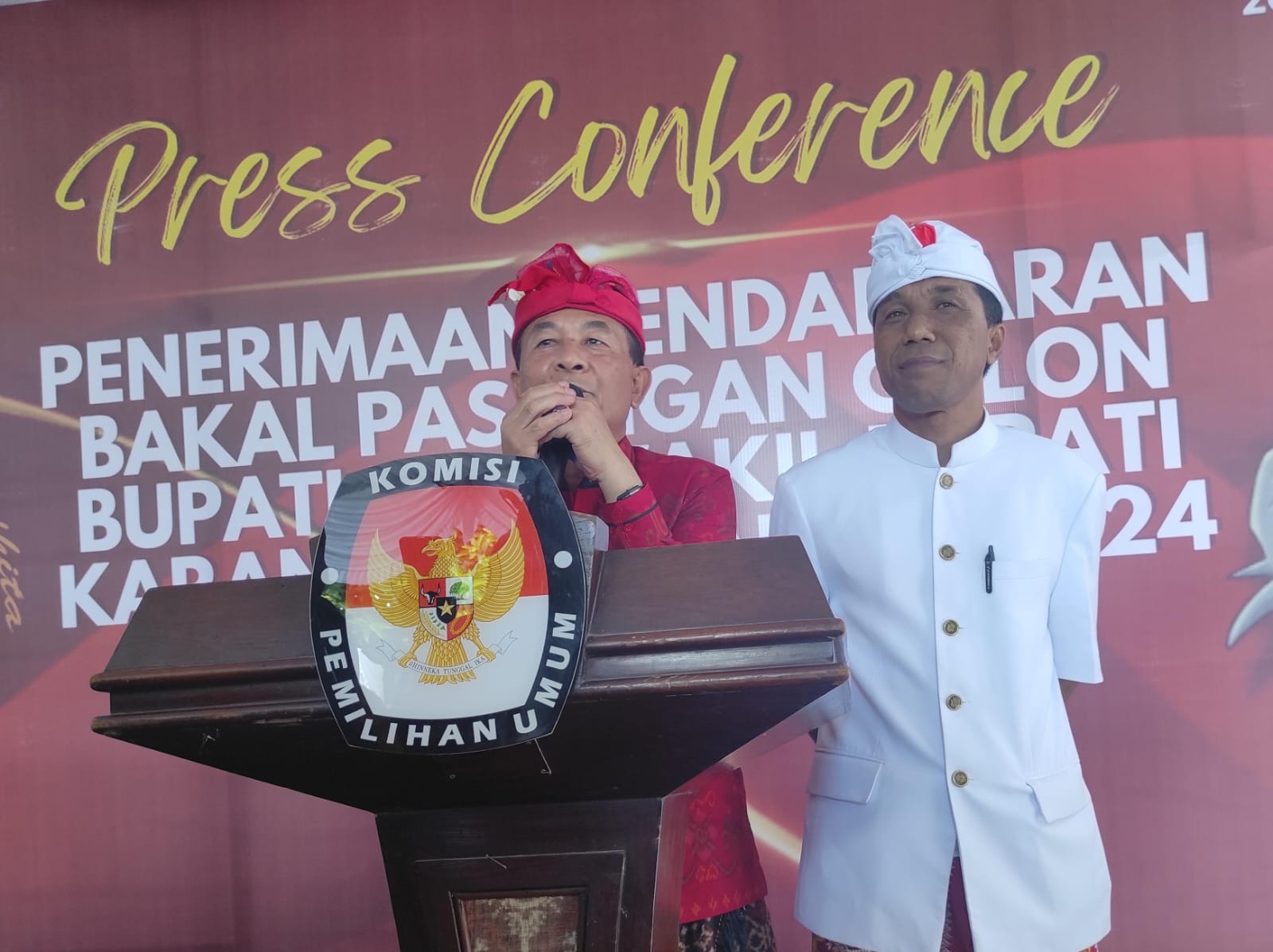 KPU Kabupaten Karangasem menerima pendaftaran dari Paslon Bupati dan Wakil Bupati Petahana, I Gede Dana dan I Nengah Swadi pada hari ke 3 pendaftaran, Kamis (29/8/2024). Usai melaksanakan Deklarasi di Lapangan Candra Buana, pasangan ini datang ke KPU dengan diiringi sekaa baleganjur dan atraksi budaya, bersama perwakilan petani, nelayan, serta pendukung lainnya.