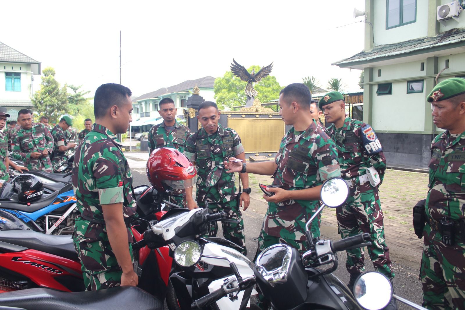 Satu persatu kelengkapan kendaraan diperiksa seperti helm, rem, ban, kondisi mesin dan lampu. Selain KTA pengemudi, kelengkapan surat-surat juga menjadi perhatian Danyonif diantaranya STNK dan SIM.