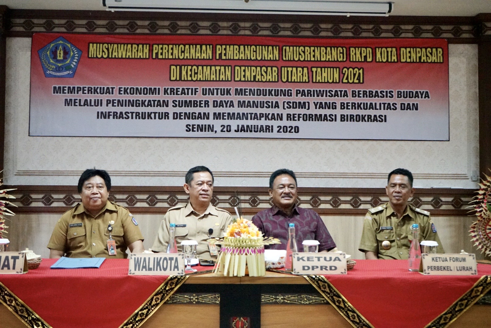 Untuk membahas dan menyepakati usulan rencana kegiatan pembangunan desa / kelurahan yang menjadi kegiatan prioritas dan menyepakati pengelompokan kegiatan pembangunan berdasarkan tugas dan fungsi perangkat daerah di Kota Denpasar, Kecamatan Denpasar Utara mengadakan Musyawarah Perencanaan Pembangunan (Musrenbang) Rancangan Kerja Pemerintah Daerah (RKPD), Senin (20/1) di Kantor Kecamatan Denpasar Utara.