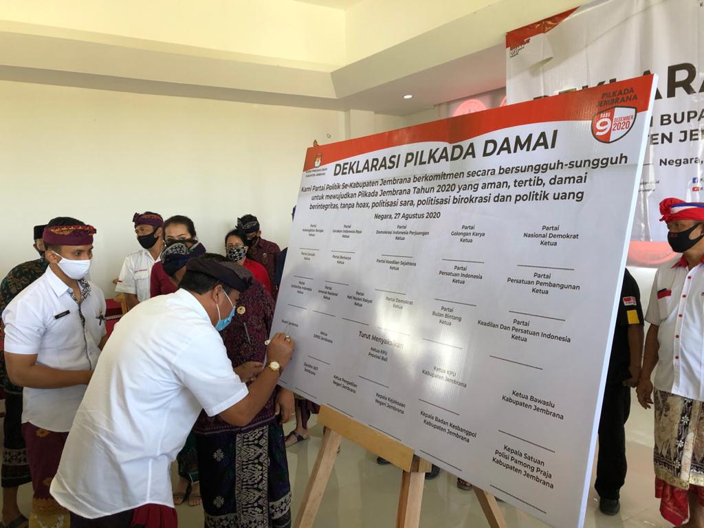 “Meski saat ini belum terdapat calon yang ditetapkan namun deklarasi damai yang menyasar partai-partai politik yang nantinya mengusung calon-calon yang akan bertarung dalam perhelatan demokrasi, untuk ikut bersama-sama mencipatakan suasana damai dan kondusif sehingga pilkada serentak tahun 2020 khusunya di Kabupaten Jembrana berjalan dengan lancar,” cetusnya.