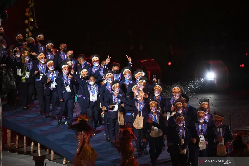Tuan rumah Papua menutup defile kontingen pada upacara pembukaan PON Papua, yang kemudian diikuti dengan pengibaran bendera 34 provinsi.