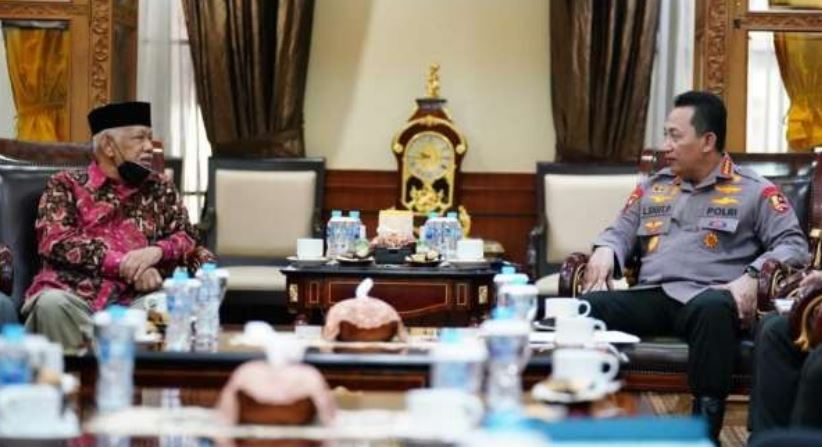 Ketua Dewan Pers, Azyumardi Azra (kiri) bersama Kepala Kepolisian Republik Indonesia, Jendral Polisi Listyo Sigit Prabowo (kanan) dalam pertemuan di Mabes Polri, Jakarta pada Selasa (21/6/2022).