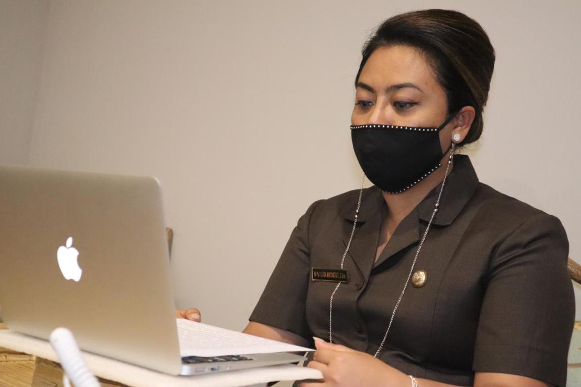 Bupati Tabanan Ni Putu Eka Wiryastuti saat Rapat paripurna ke-13, masa persidangan ketiga Tahun 2020, yang dilaksanakan secara daring melalui aplikasi Zoom, Selasa (24/11).