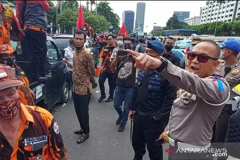 Direktur Lalu Lintas Polda Metro Jaya Kombes Polisi Sambodo Purnomo Yogo marah setelah mengetahui anggotanya dipukuli oleh massa dari Pemuda Pancasila saat unjuk rasa di depan Gedung DPR/MPR RI, Jakarta, Kamis.