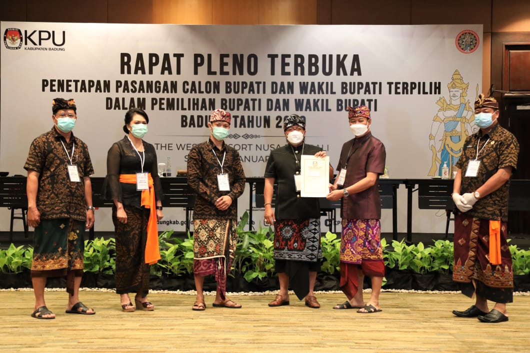 Ketua KPU Badung I Wayan Semara Cipta mengatakan Rapat Pleno Terbuka Penetapan Pasangan Calon Bupati dan Wakil Bupati Terpilih dalam Pemilihan Bupati dan Wakil Bupati Badung tahun 2020 ini dalam rangka melaksanakan ketentuan pasal 54 ayat 1 Peraturan KPU nomor 19 tahun 2020 tentang Perubahan atas Peraturan KPU Nomor 9 tahun 2018 tentang Rekapitulasi Hasil Penetapan Pasangan Calon Terpilih Pemilihan Serentak tahun 2020. Dan penetapan paslon bupati dan wakil bupati terpilih ini dituangkan dalam berita acara KPU Kabupaten Badung Nomor : 089/PL.02.7-BA/5103/KPU-