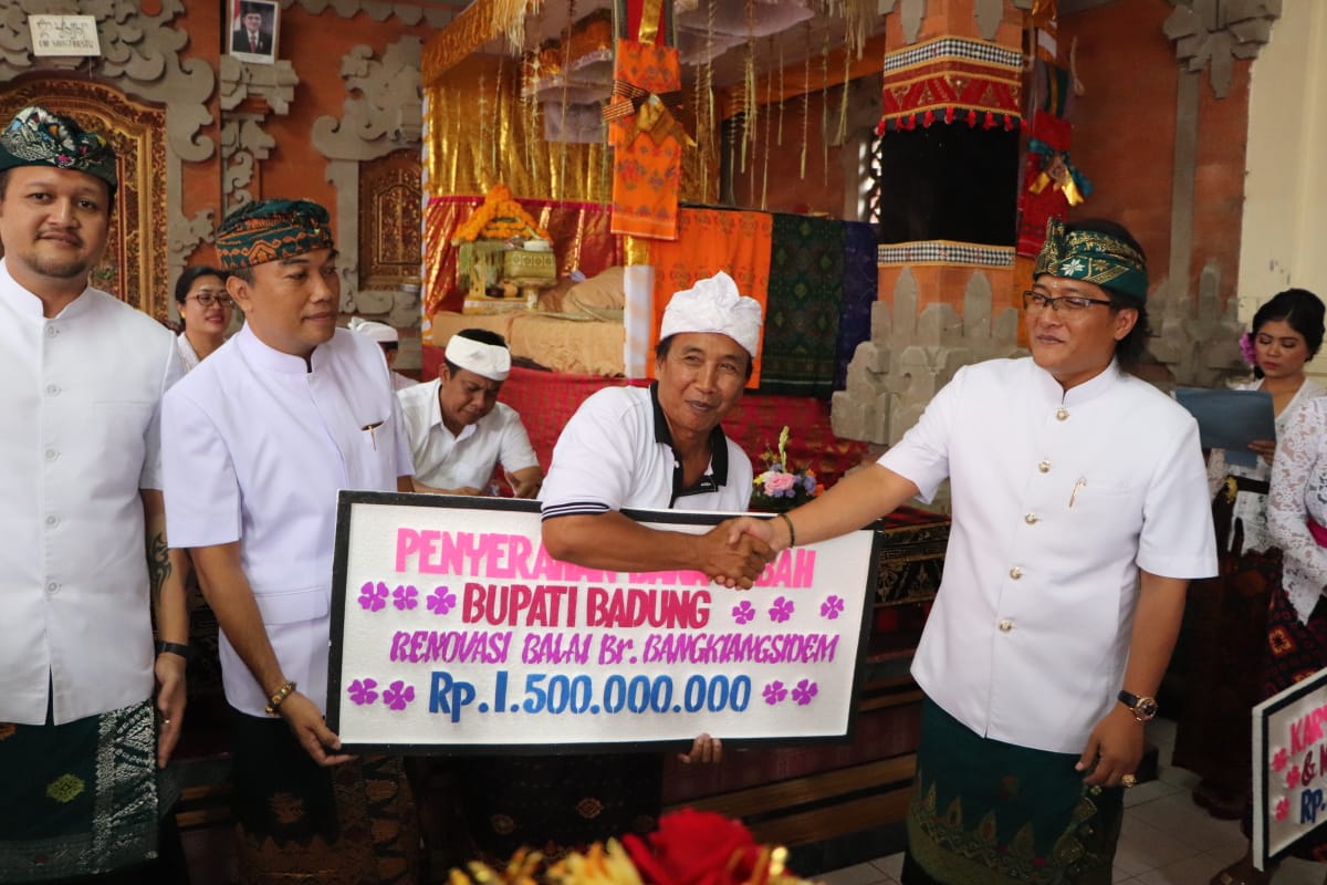 Dalam kesempatan ini Bupati Giri Prasta menyerahkan secara simbolis Bantuan Pemerintah Kabupaten Badung untuk karya Pitra Yadnya dan Manusa Yadnya Rp. 300 juta serta Dana Hibah Rp. 1,5 milliar untuk Pembangunan Balai Banjar dan Hibah bantuan seperangkat Gong Rp. 268 juta.