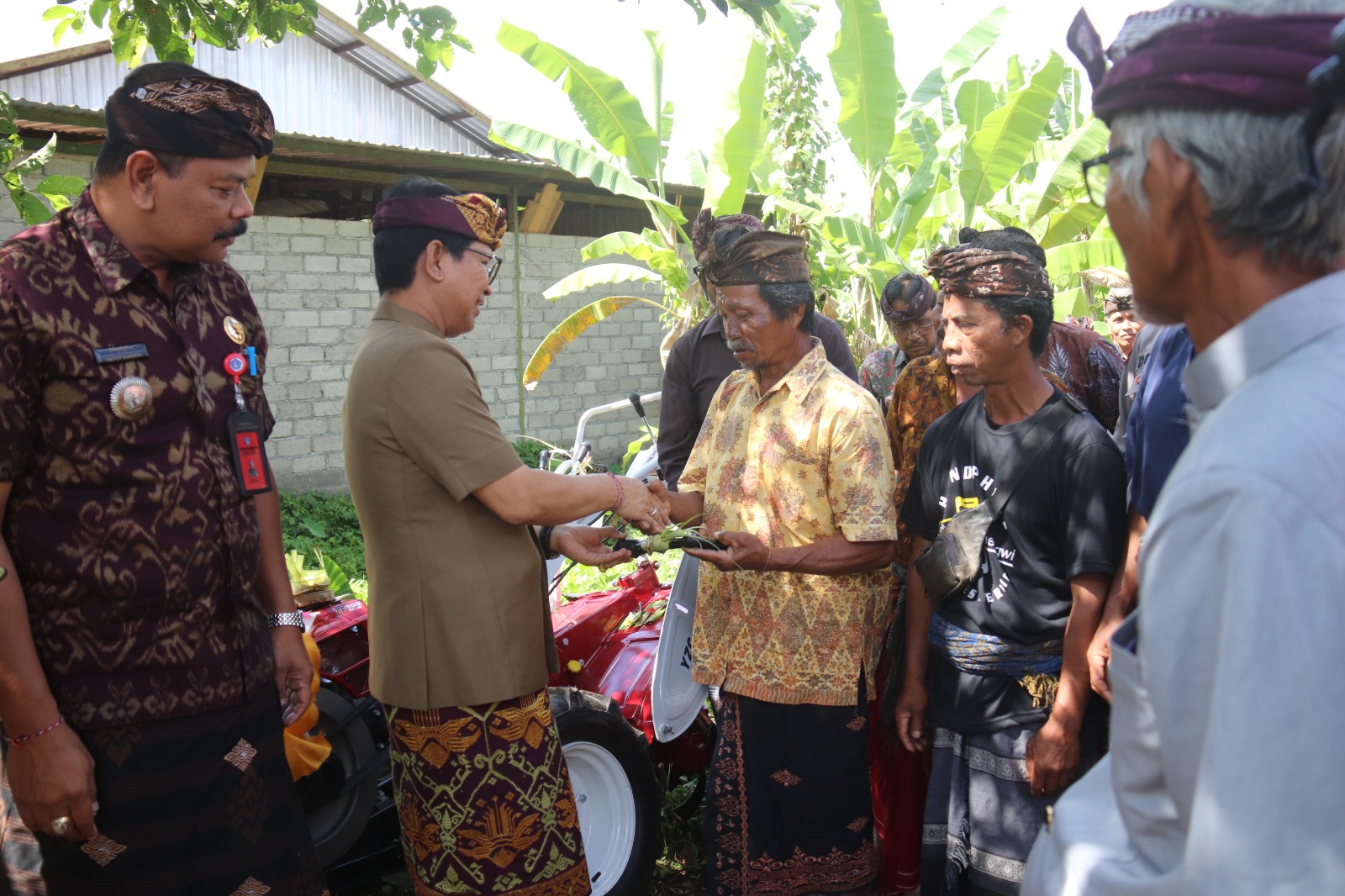 Sekda Adi Arnawa menyerahkan bantuan Alsintan berupa 4 traktor kepada petani Subak Yeh Dukuh, Banjar Dangin Bingin, Desa Sembung, Kamis (27/7).