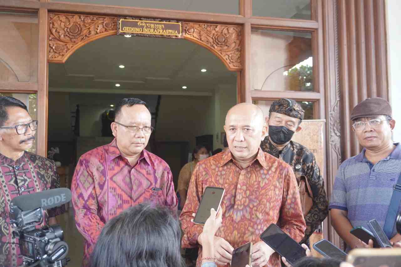 Foto: Menteri Koperasi dan UKM RI Teten Masduki memberikan keterangan kepada awak media usai hadir di acara Wellness Talk: Masa Depan Tradisi Welness Bali di Kampus UNHI Denpasar, pada Jumat (6/5/2022).