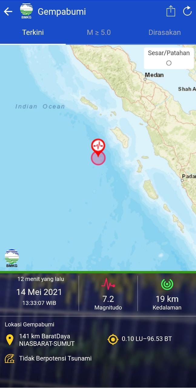 Gempabumi dengan parameter magnitudo 7.2 dirasakan kuat oleh masyarakat di Kabupaten Nias Barat, Sumatera Utara, Jumat (14/5) pukul 13.33 WIB.