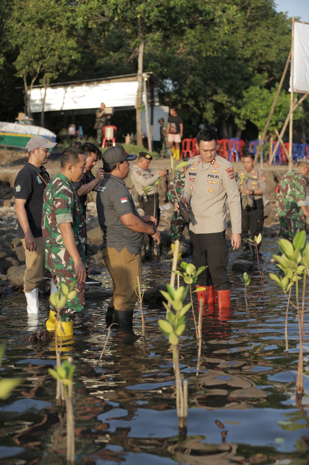 Dalam melaksanakan penanaman pohon sebanyak 5 ribu pohon bakau, Polres Buleleng bersama dengan unsur Forkompinda Kabupaten Buleleng yang dihadiri Kepala Dinas Lingkungan Hidup Kabupaten Buleleng, Komandan Kodim 1609/Buleleng Letkol Arh Tamaji,S.Sos, Kapolres Buleleng AKBP I Made Dhanuardana S.I.K., M.H., unsur Forkompincam Gerokgak dan masyarakat Desa Pemuteran serta satgas peduli lingkungan.