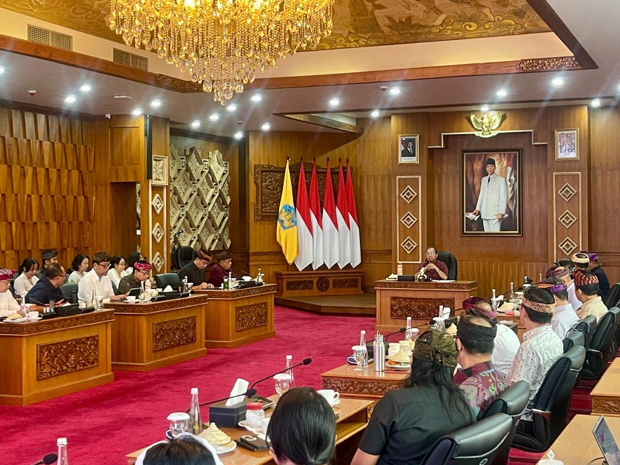 Hadir dalam rapat tersebut Tim Percepatan Pelaksanaan Layanan Kesehatan Tradisional yang dikoodinatori oleh Prof. apt. Dr. rer.nat I Made Agus Gelgel Wirasuta, M.Si.., Kepala Dinas Kesehatan Provinsi Bali, Kepala Dinas Pertanian dan Ketahanan Pangan Provinsi Bali, Kepala Dinas Perindustrian dan Perdagangan Provinsi Bali, serta undangan terkait lainnya.(Humas Pemprov Bali)