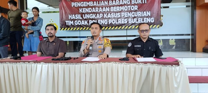 Pengembalian 8 Barang Bukti (BB) kendaraan bermotor (Ranmor) hasil ungkap kasus pencurian Tim Goak Poleng, dipimpin langsung Kapolres Buleleng AKBP Ida Bagus Widwan Sutadi S.I.K, M.H, didampingi Kasat Reskrim Polres Buleleng AKP I Gusti Nyoman Jaya Widura S.T.K, S.I.K, M.H dan Kasi Humas Polres Buleleng AKP Gede Dharma Diatmika S.H di Lobby Polres Buleleng pada Selasa, (29/10/2024)