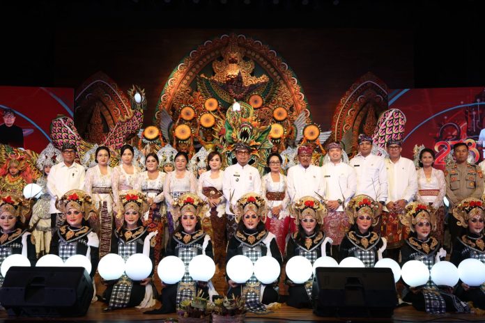 Ket Foto: Wakil Walikota Denpasar, I Kadek Agus Arya Wibawa, Ketua DPRD Kota Denpasar, I Gusti Ngurah Gede, Sekretaris Daerah Kota, I Gusti Ngurah Eddy Mulya dan seluruh jajaran tamu undangan lainnya berfoto bersama para seniman usai inaugurasi Surya Candra Jagaditha, di Gedung DNA, Jumat (27/2)
