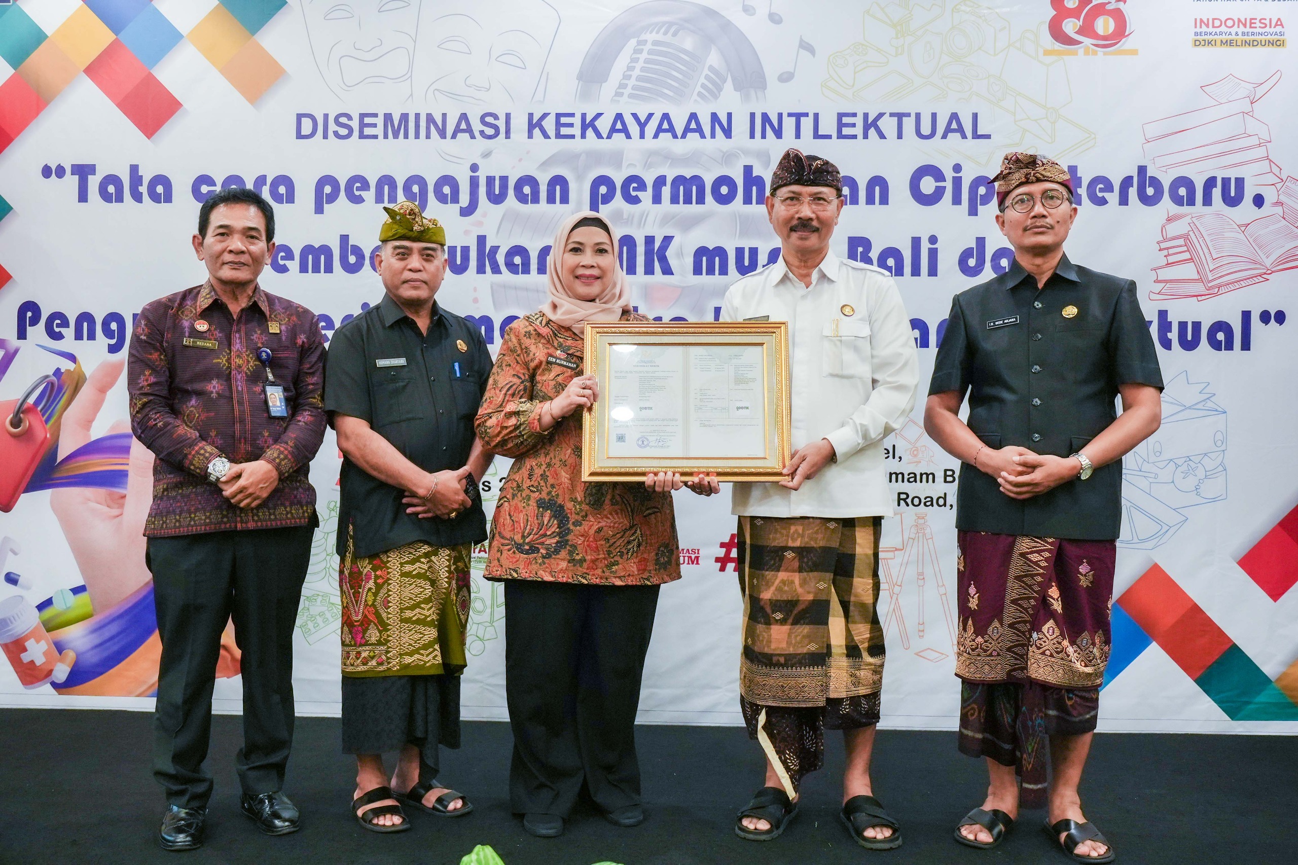 Sertifikat diserahkan dalam acara Diseminasi Kekayaan Intelektual bertajuk “Tata Cara Pengajuan Permohonan Cipta Terbaru, Pembentukan LMK Musik Bali dan Penguatan Kerjasama Sentra Kekayaan Intelektual” pada Kamis (7/8/2025) di B Hotel JI. Imam Bonjol, Pemecutan Klod, Kec. Denpasar Barat, Kota Denpasar.