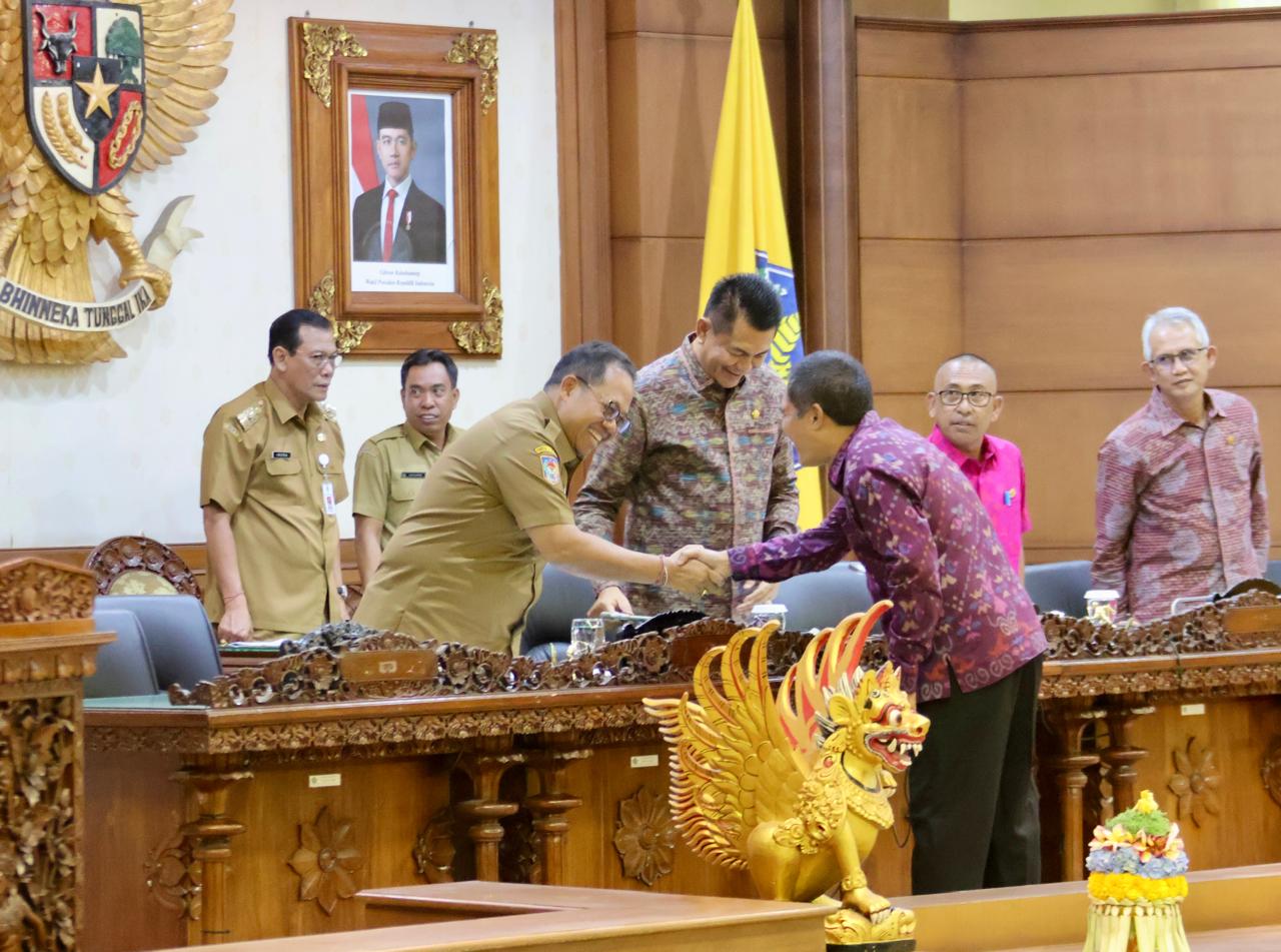 Penjabat Gubernur Bali, S. M. Mahendra Jaya, menyampaikan jawaban terhadap pandangan umum fraksi atas Raperda tentang Anggaran Pendapatan dan Belanja Daerah Semesta Berencana Provinsi Bali Tahun Anggaran 2025 dalam Rapat Paripurna DPRD Provinsi Bali Masa Sidang ke-1 Tahun Sidang 2024-2025 di Gedung DPRD Bali, Denpasar pada Senin (28/10).