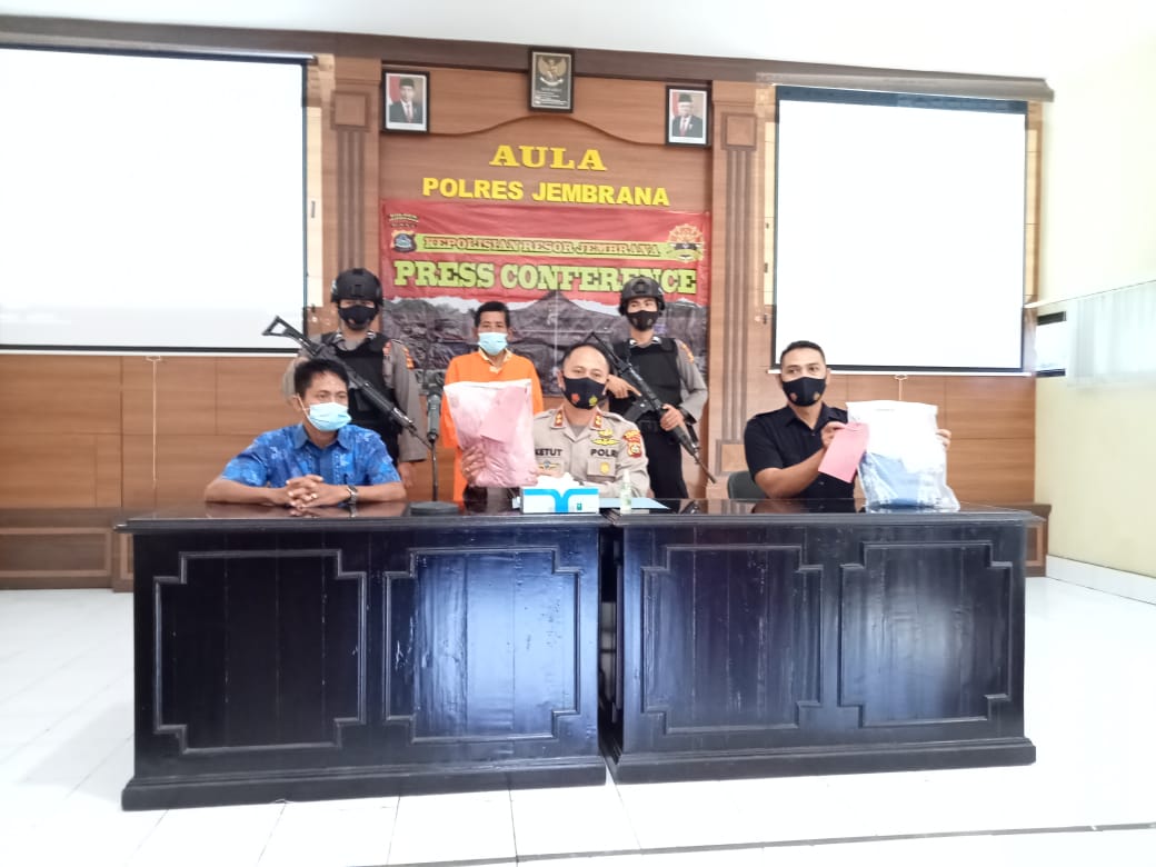“Pelaku diamankan di rumahnya hari itu juga. Pelaku memang sempat melarikan diri, tapi kita tangkap di rumahnya” terang Kapolres Jembrana AKBP Ketut Gede Adi Wibawa didampingi Kasubag Humas Iptu Ketut Suartawan di Polres Jembrana, Jumat (18/6/2021).